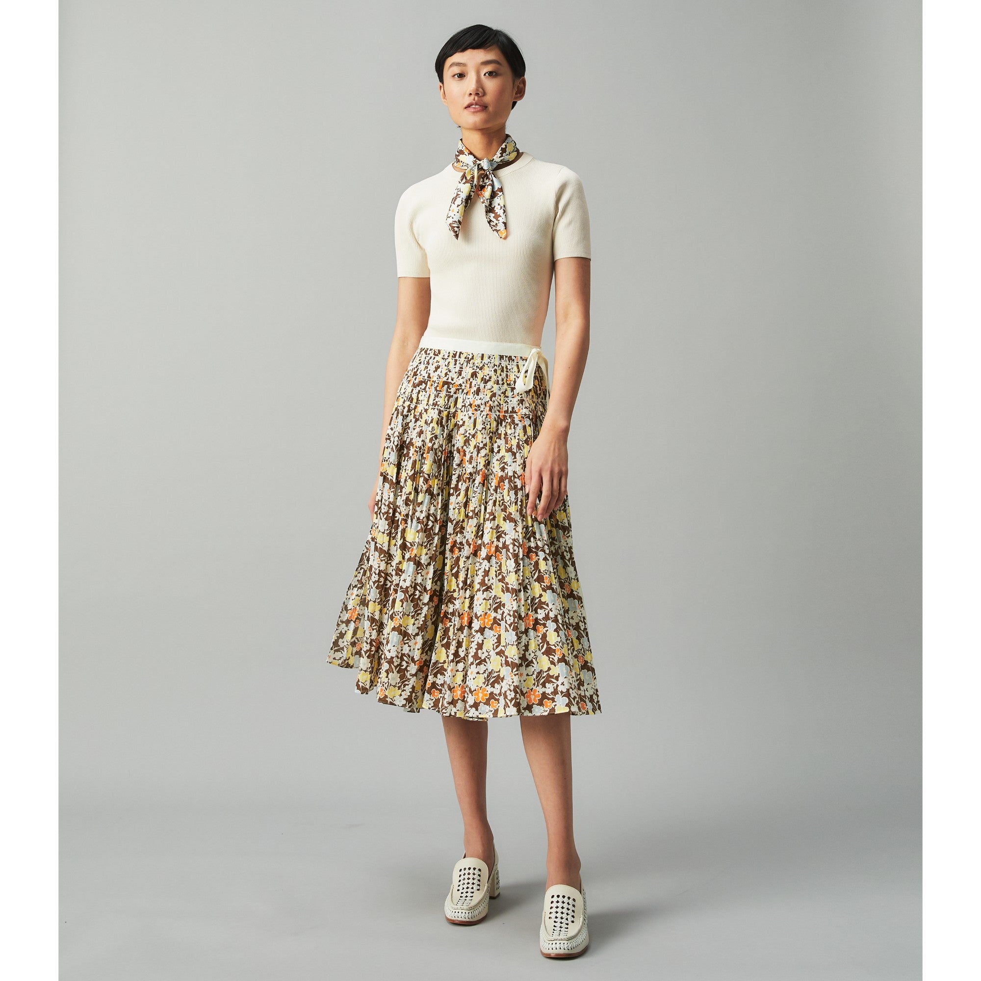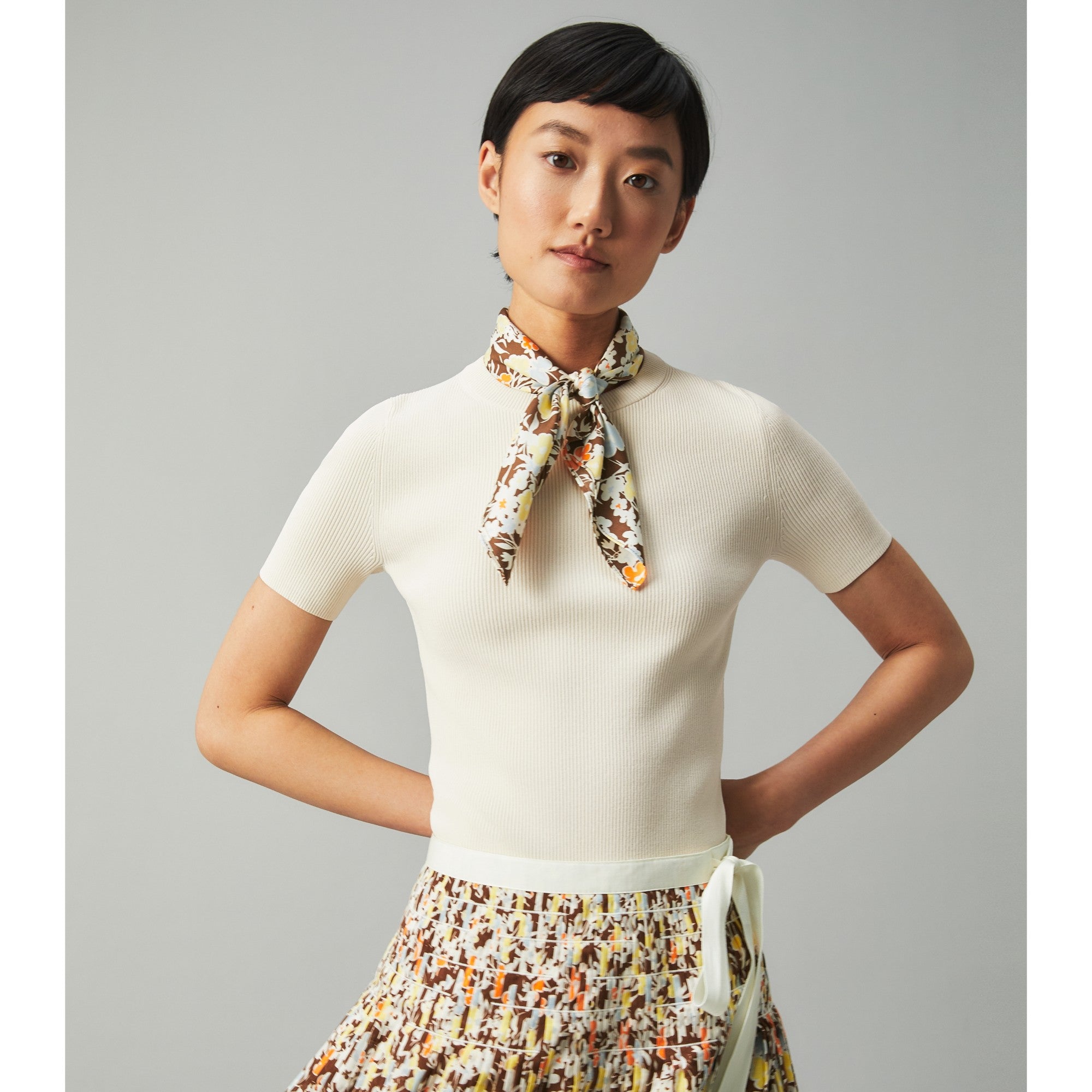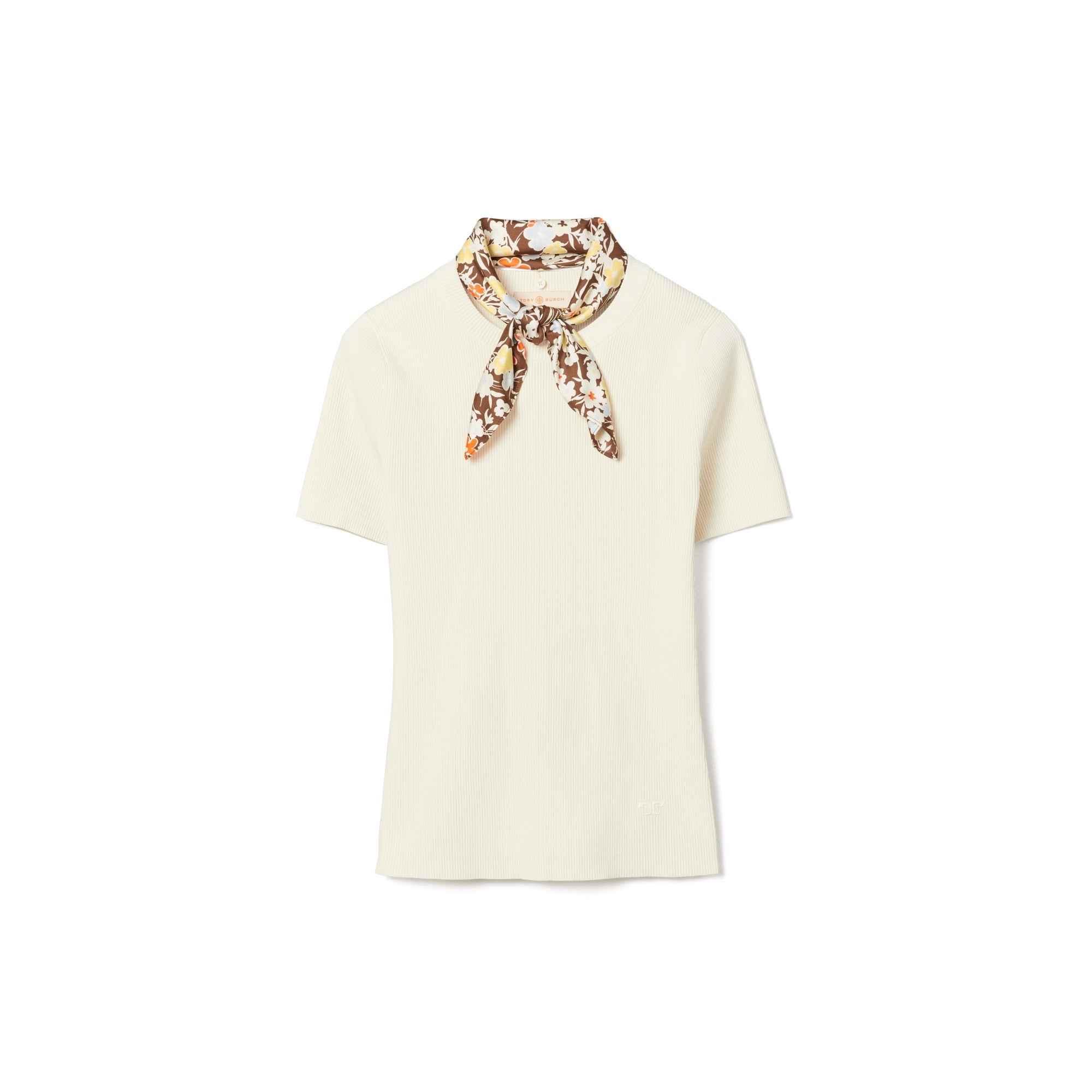 Women short sleeve sweater with scarf - classic ivory