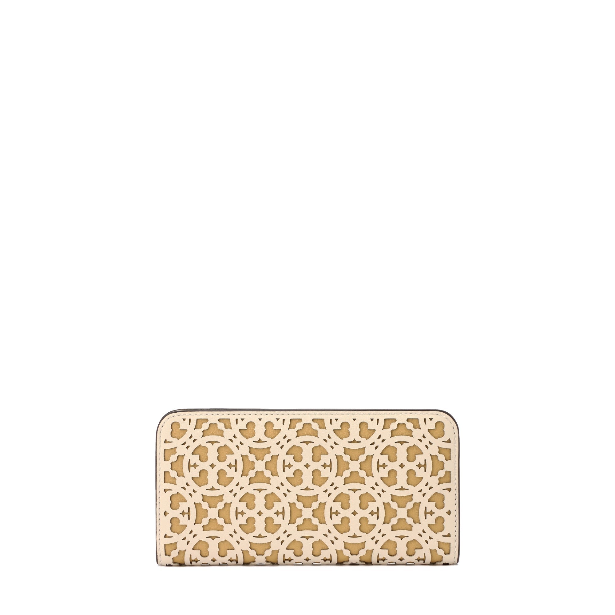 Women T Monogram Laser Cut Zip Slim Wallet - New Ivory / Beeswax